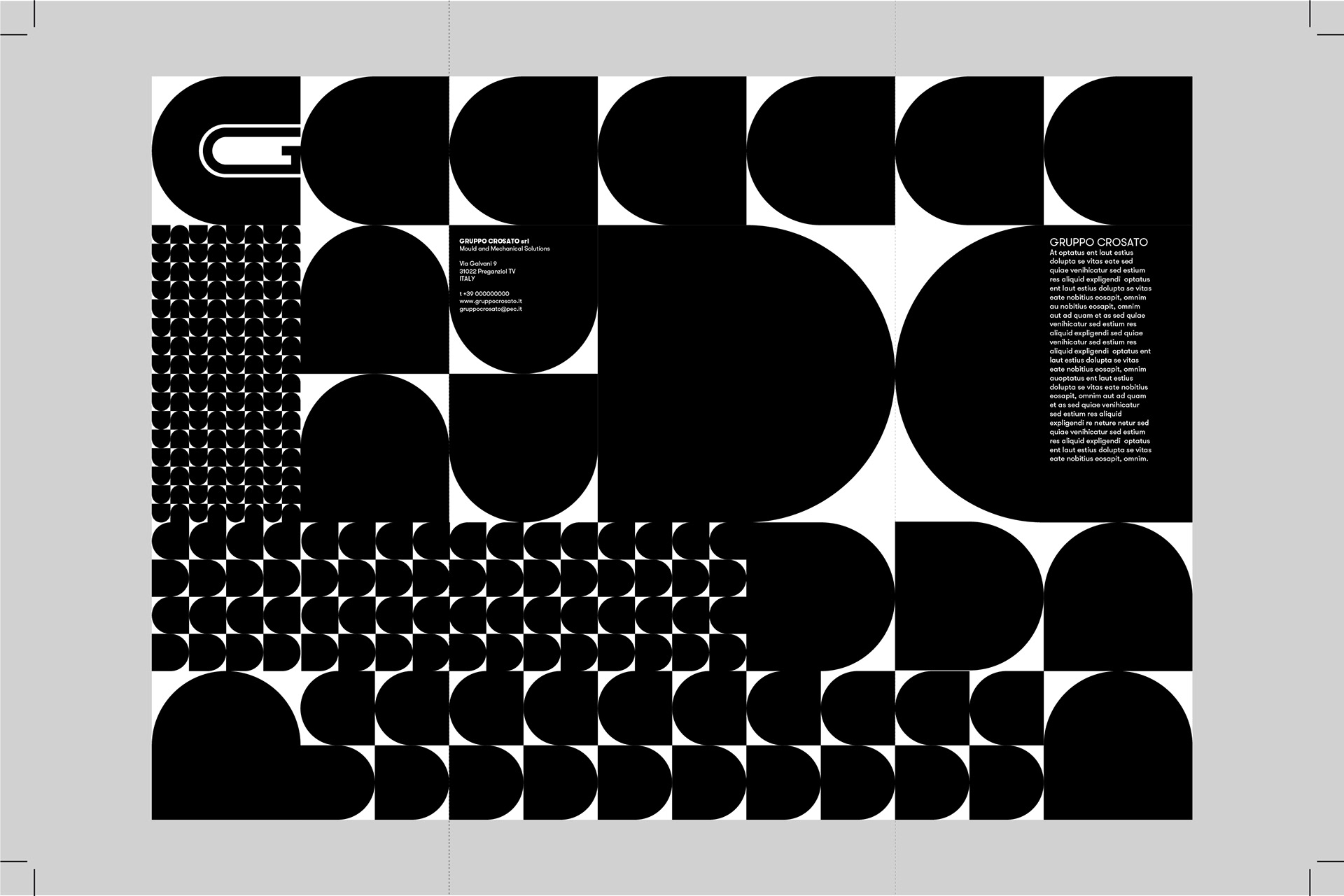 Gruppo Crosato è un’azienda di recente costituzione impegnata nella progettazione e nella realizzazione di stampi in acciaio destinati alla pressofusione dell’alluminio. La compenetrazione delle due iniziali che formano il monogramma “GC”, rimanda direttamente al processo industriale della fusione. Dal punto di vista formale va considerato quale omaggio alle esperienze di capiscuola della grafica industriale italiana quali Silvio Coppola e Giulio Confalonieri.
